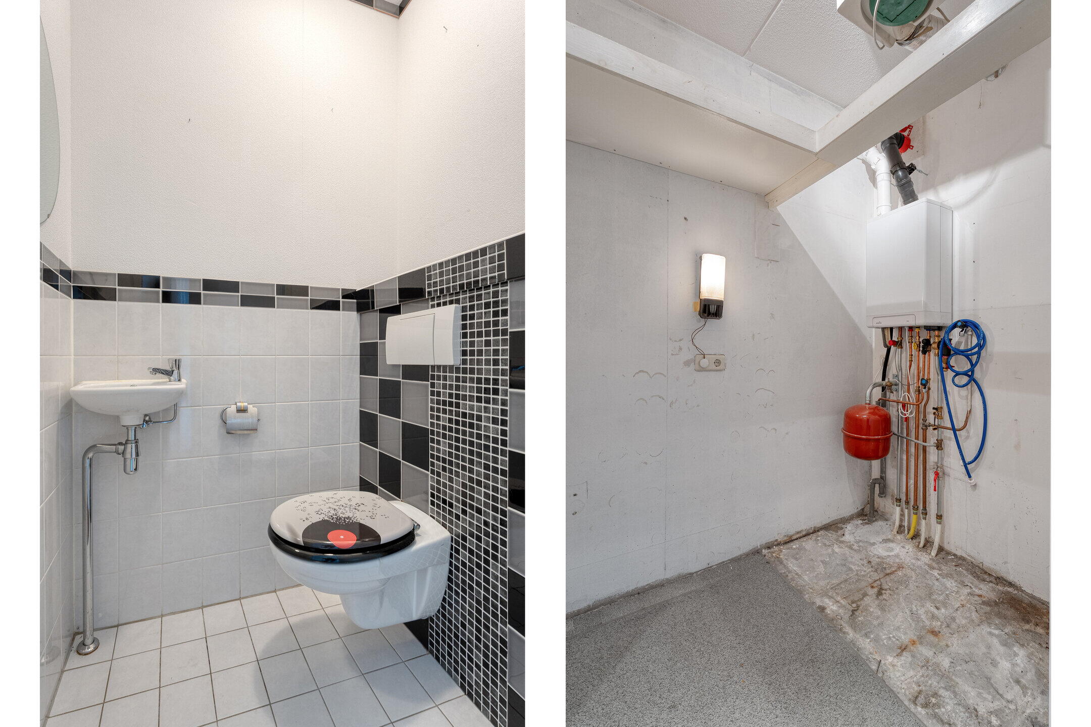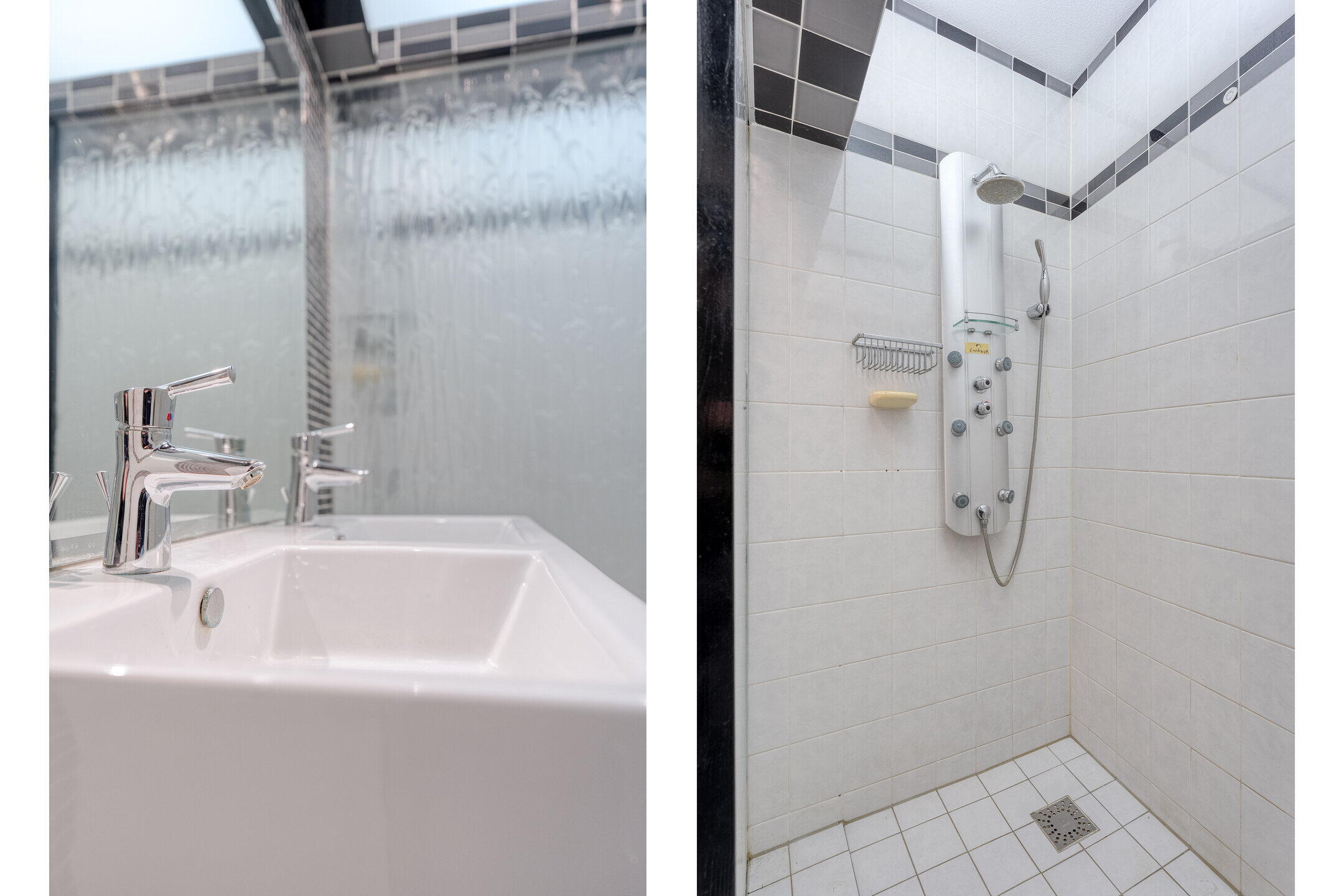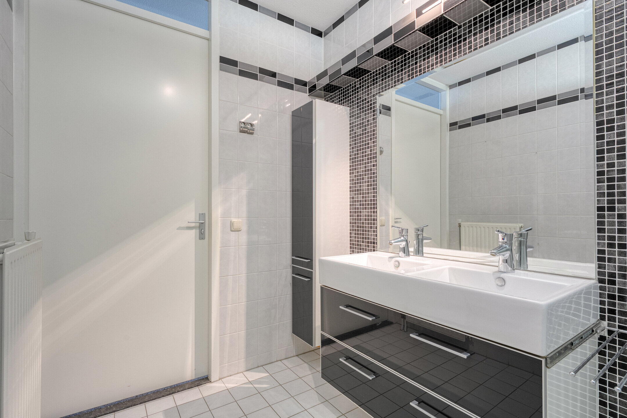 Vanuit de gang zijn de twee slaapkamers van respectievelijk 8,5 en 14 m² waarbij de grote slaapkamer beschikt over een schuifwand/inbouwkast. Ruime betegelde badkamer in inloop douche, wastafelmeubel met dubbele wasbak. Separate toiletruimte met wandcloset en fontein. Inpandige berging met opstelplaats voor witgoed en opstelling cv ketel.