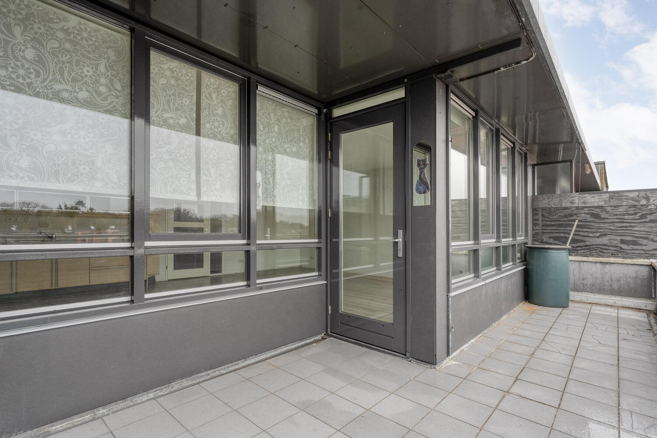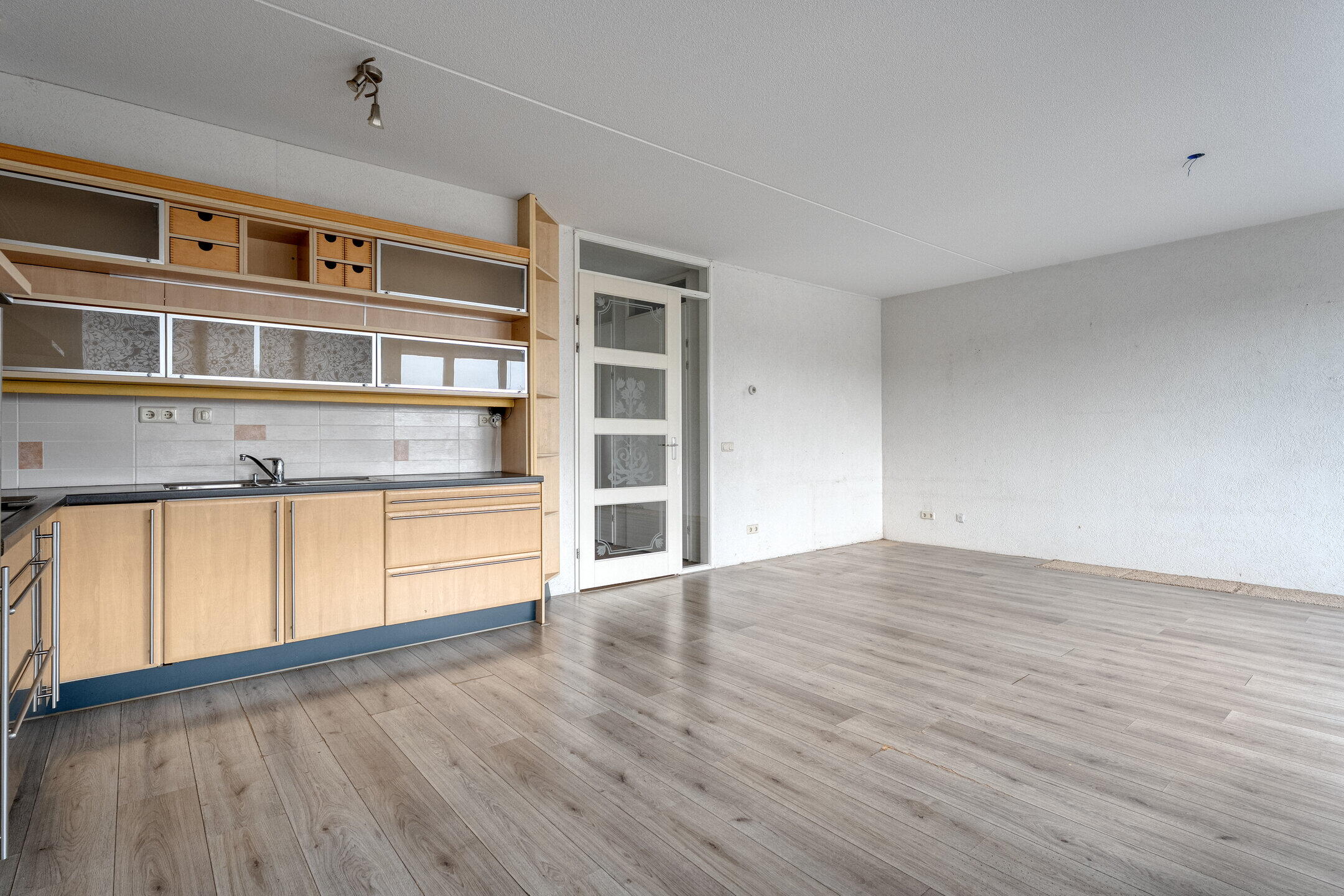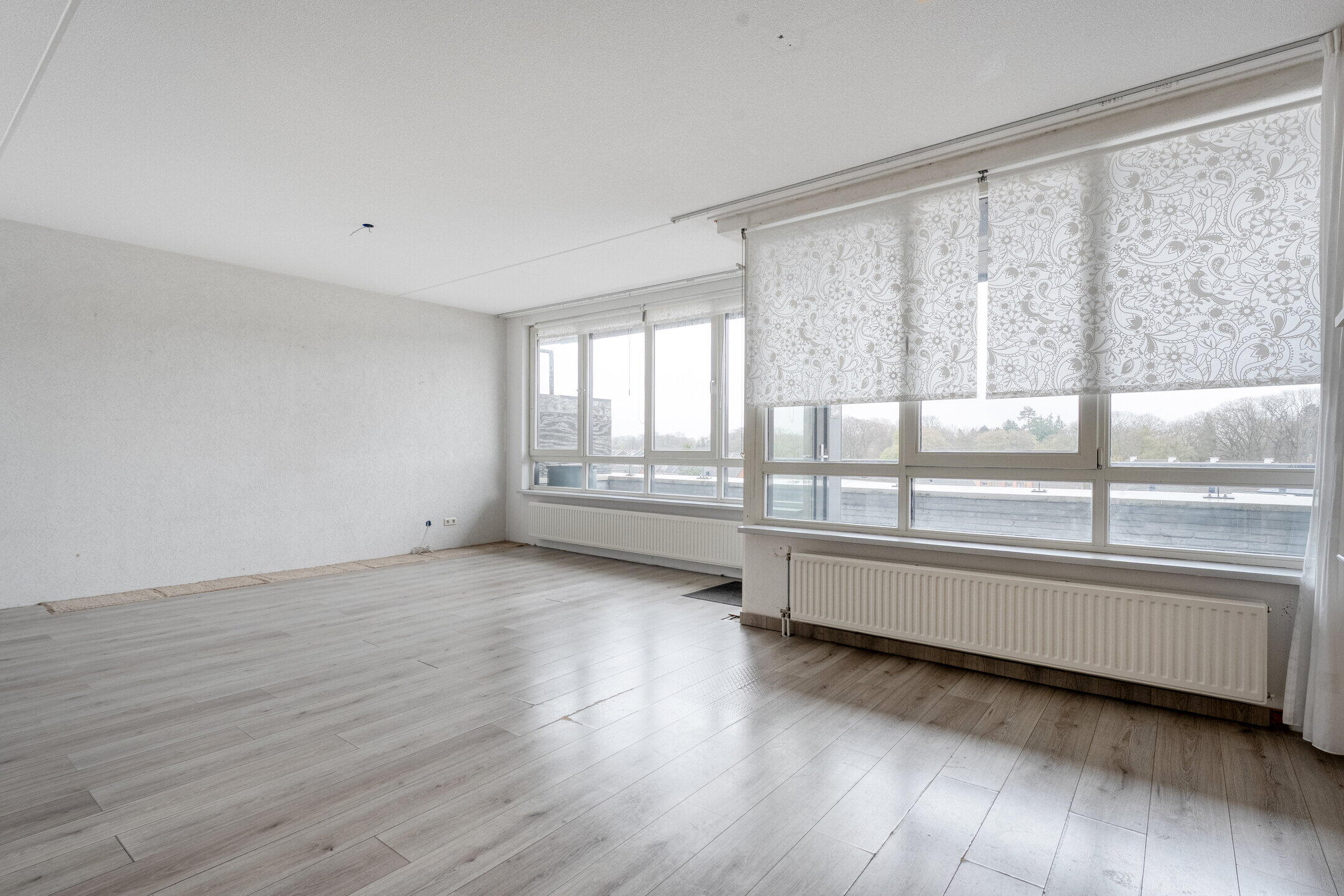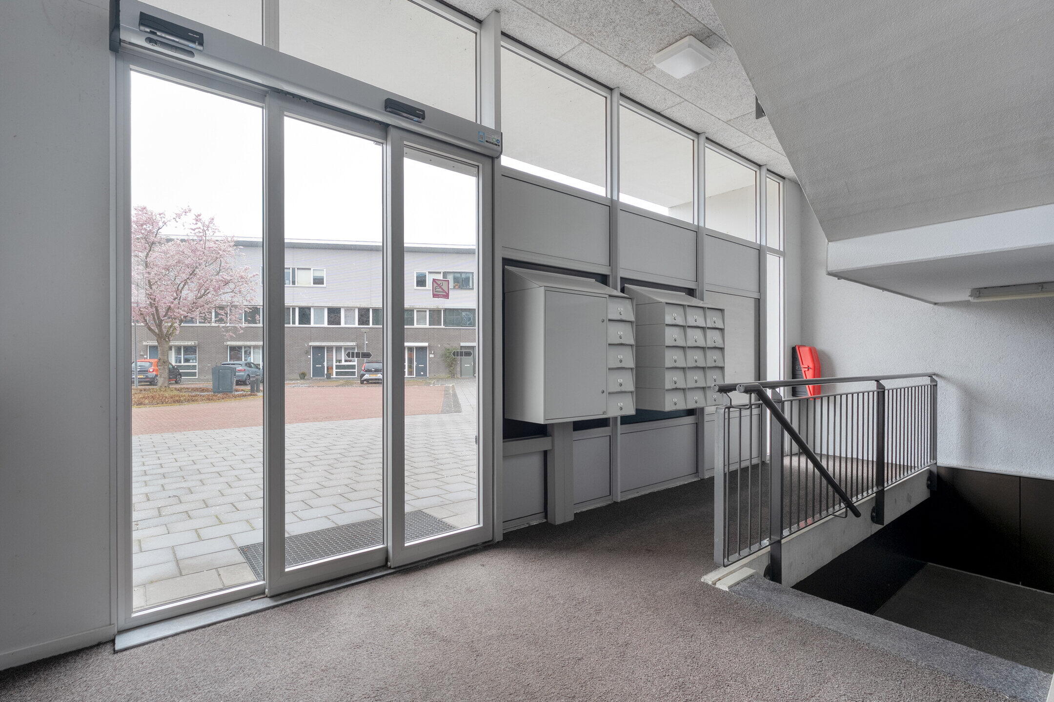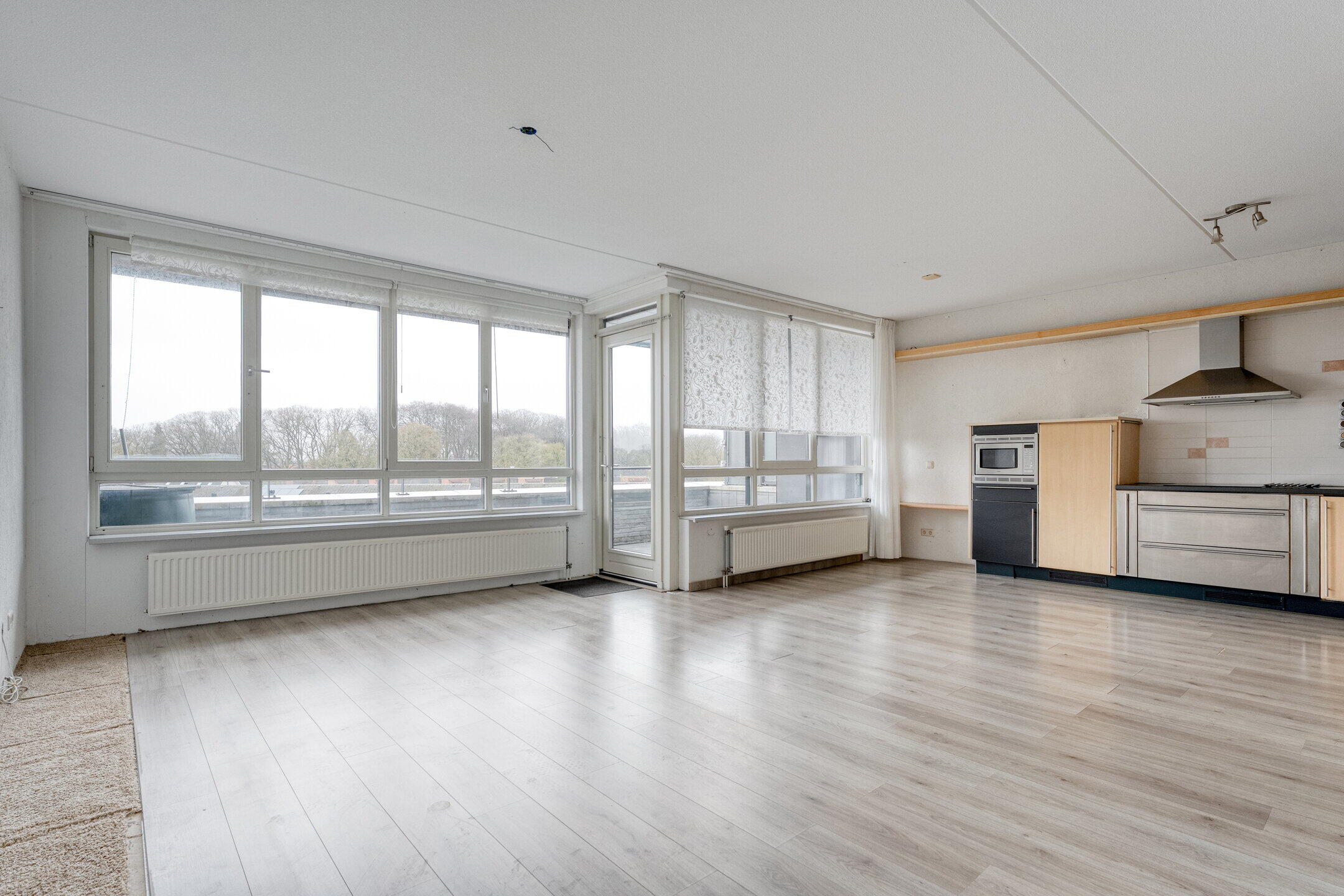 Centrale hoofdingang van het complex met trappenhuis en lift. De ingang van het appartement bevindt zich op de vierde verdieping aan de noordzijde met een afgeschermde galerij waar je ook heerlijk kunt zitten. De centrale gang in het appartement eindigt in de mooie lichte woonkamer met grote raampartijen en balkondeur naar het vrije balkon van circa 15 m². Verder is er een open (gedateerde) inbouwkeuken met inductiekookplaat, koelkast en combioven.