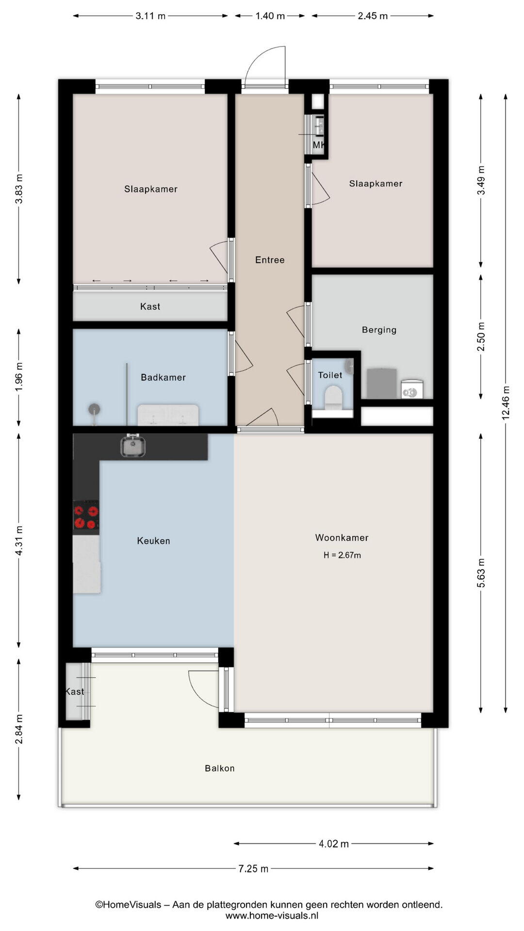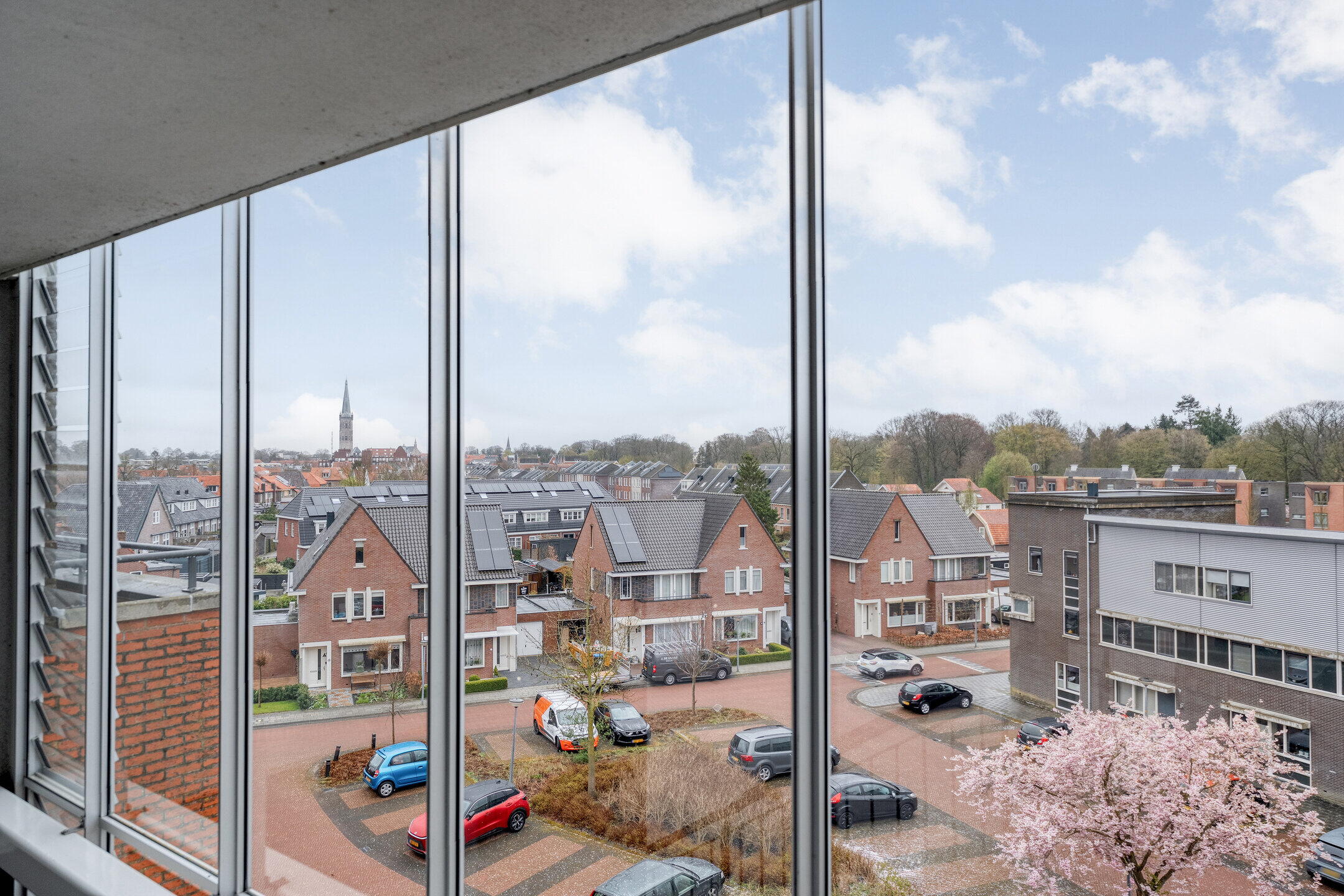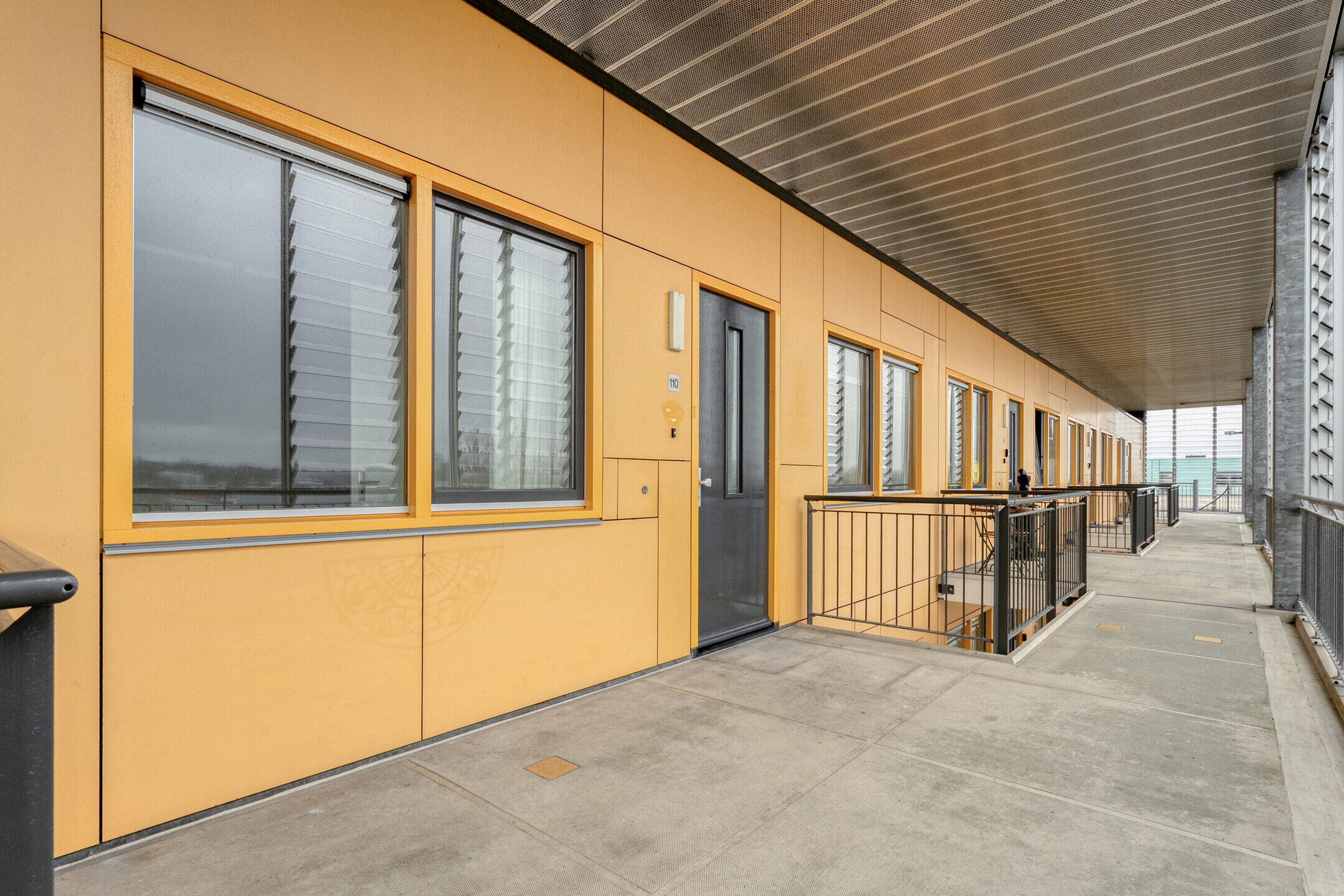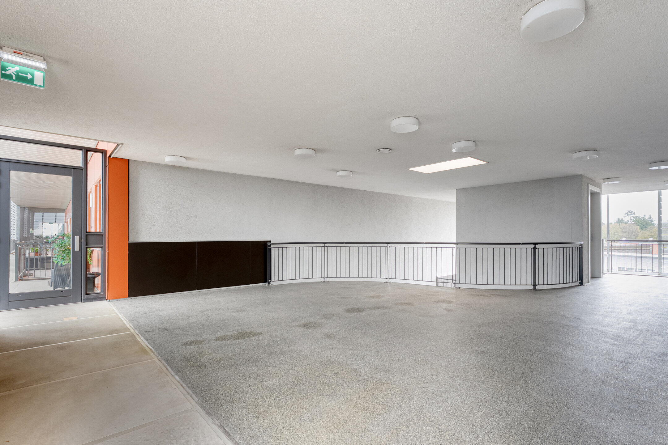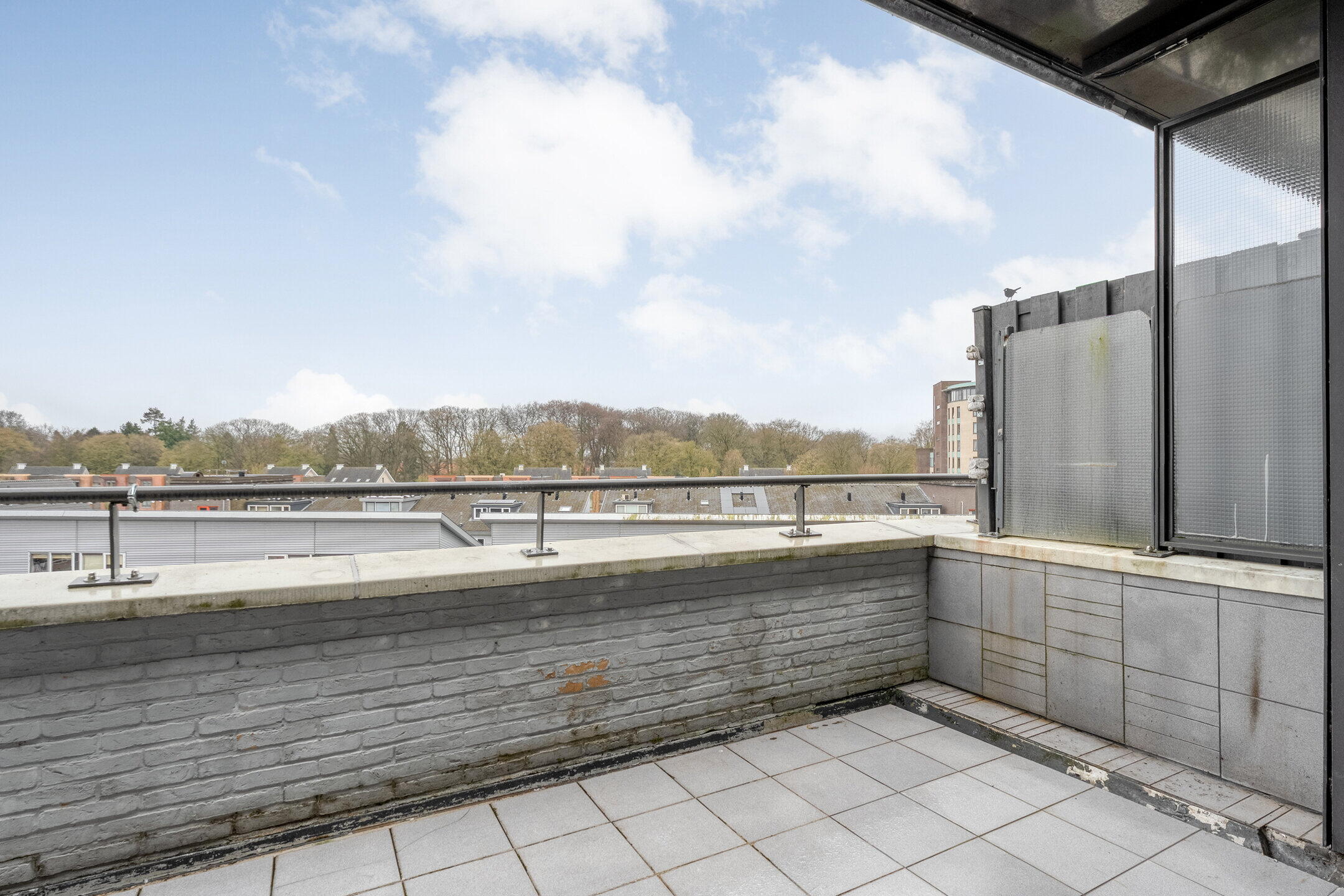 Centrale hoofdingang van het complex met trappenhuis en lift. De ingang van het appartement bevindt zich op de vierde verdieping aan de noordzijde met een afgeschermde galerij waar je ook heerlijk kunt zitten. De centrale gang in het appartement eindigt in de mooie lichte woonkamer met grote raampartijen en balkondeur naar het vrije balkon van circa 15 m². Verder is er een open (gedateerde) inbouwkeuken met inductiekookplaat, koelkast en combioven.